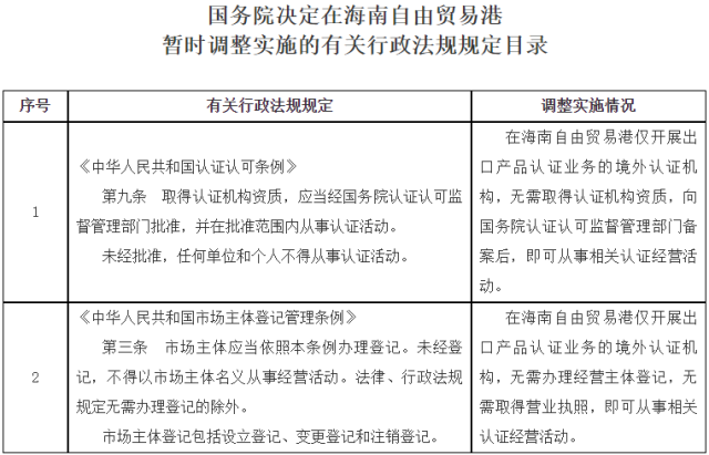 一、為支持海南自由貿(mào)易港建設(shè),按照《海南自由貿(mào)易港建設(shè)總體方案》,同意自即日起在海南自由貿(mào)易港暫時調(diào)整實施《中華人民共和國認(rèn)證認(rèn)可條例》《中華人民共和國市場主體登記管理條例》有關(guān)規(guī)定(目錄附后),在海南自由貿(mào)易港僅開展出口產(chǎn)品認(rèn)證業(yè)務(wù)的境外認(rèn)證機構(gòu),無需取得認(rèn)證機構(gòu)資質(zhì)和辦理經(jīng)營主體登記,向國務(wù)院認(rèn)證認(rèn)可監(jiān)督管理部門備案后,即可開展出口產(chǎn)品認(rèn)證業(yè)務(wù),認(rèn)證結(jié)果僅限出口企業(yè)境外使用。備案條件和程序由國務(wù)院認(rèn)證認(rèn)可監(jiān)督管理部門制定。