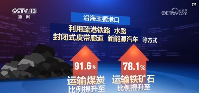 貨物“公轉鐵”“公轉水”深入推進,沿海主要港口利用疏港鐵路、水路、封閉式皮帶廊道、新能源汽車等方式運輸煤炭、鐵礦石的比例提升至91.6%和78.1%。