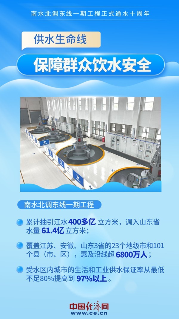 2013年11月15日,南水北調東線一期工程正式通水。通水10年來,東線一期工程累計抽引江水400多億立方米,調入山東省水量61.4億立方米,有效緩解了南水北調東線沿線受水區缺水問題,受益人口超6800萬人,成為優化水資源配置、保障群眾飲水安全、復蘇河湖生態環境、暢通南北經濟循環的生命線。