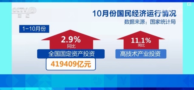看投資,固定資產投資規模繼續擴大,高技術產業投資增長較快。1—10月份,高技術產業投資同比增長11.1%。總體看,10月份,國民經濟持續恢復向好。