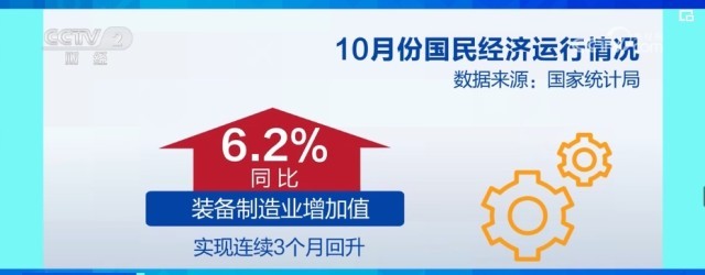 10月份,全國規模以上工業增加值比上月加快0.1個百分點。其中,裝備制造業增加值同比增長6.2%,比上月加快0.7個百分點,連續3個月回升。