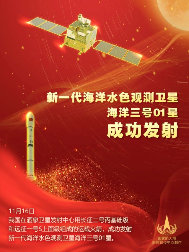 中國青年報客戶端北京11月16日電(張未 王豪 李儀 中青報·中青網記者 邱晨輝)北京時間11月16日11時55分,我國在酒泉衛星發射中心用長征二號丙基礎級和遠征一號S上面級組成的運載火箭,成功發射新一代海洋水色觀測衛星海洋三號01星。該衛星指標達到國際水色遙感衛星先進水平,可滿足我國海洋環境監測的主體業務需求,并能夠服務于生態文明建設、智慧海洋工程建設、“一帶一路”倡議等國家重大戰略需求。