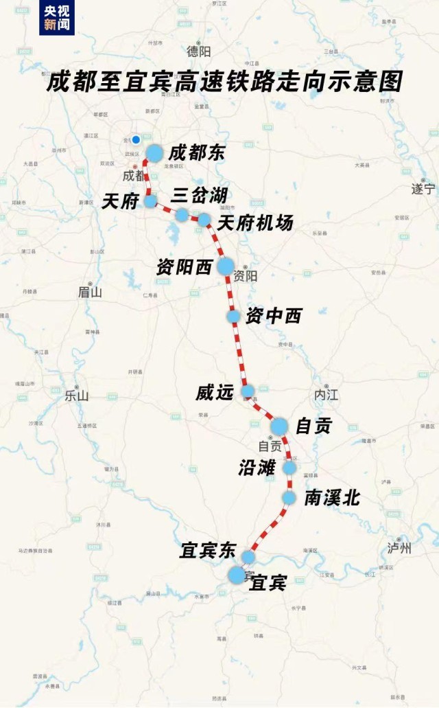 成都至宜賓高速鐵路由新建成都東至宜賓東高速鐵路(以下簡(jiǎn)稱(chēng)“成宜高鐵”)和新建重慶至昆明高速鐵路宜賓東至宜賓(以下簡(jiǎn)稱(chēng)“渝昆高鐵宜賓段”)組成。線路北起成宜高鐵成都東站,止于渝昆高鐵宜賓站。成都至宜賓高速鐵路為雙線高速鐵路,全線共設(shè)成都東、天府、三岔湖、天府機(jī)場(chǎng)、資陽(yáng)西、資中西、威遠(yuǎn)、自貢、沿灘、南溪北、宜賓東、宜賓等12個(gè)車(chē)站,其中成都東和自貢站為既有站,天府站為緩開(kāi)站。
