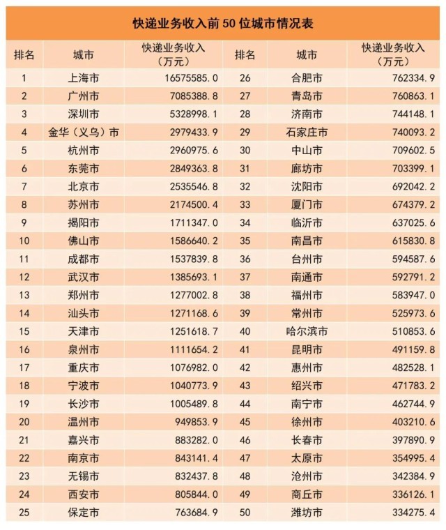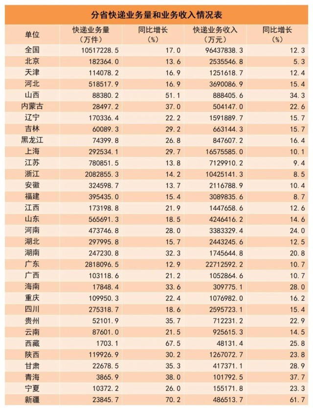 1-10月,郵政行業業務收入(不包括郵政儲蓄銀行直接營業收入)累計完成12351.5億元,同比增長11.5%。其中,快遞業務收入累計完成9643.8億元,同比增長12.3%。