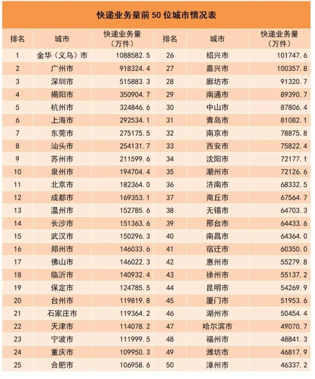 1-10月,同城快遞業務量累計完成108.3億件,同比增長2.7%;異地快遞業務量累計完成919.2億件,同比增長18.2%;國際/港澳臺快遞業務量累計完成24.2億件,同比增長55.1%。