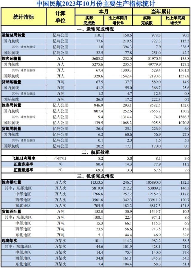 民航局11月20日發布10月份主要生產指標統計顯示,今年10月,運輸總周轉量達到110.1億噸公里,同比增長158.6%;中國民航旅客運輸量達到5605.2萬人,同比增長252%;10月貨郵運輸量為67.5萬噸,同比增長37.7%。
