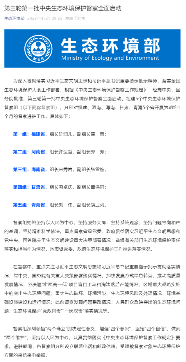 央視網(wǎng)消息:據(jù)生態(tài)環(huán)境部消息,為深入貫徹落實(shí)習(xí)近平生態(tài)文明思想和習(xí)近平總書記重要指示批示精神,落實(shí)全國生態(tài)環(huán)境保護(hù)大會(huì)工作部署,根據(jù)《中央生態(tài)環(huán)境保護(hù)督察工作規(guī)定》,經(jīng)黨中央、國務(wù)院批準(zhǔn),第三輪第一批中央生態(tài)環(huán)境保護(hù)督察全面啟動(dòng)。組建5個(gè)中央生態(tài)環(huán)境保護(hù)督察組(以下簡稱督察組),分別對(duì)福建、河南、海南、甘肅、青海5個(gè)省開展為期約1個(gè)月的督察進(jìn)駐工作,具體如下: