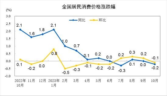國家統計局數據顯示,2023年10月,全國CPI環比下降0.1%,同比下降0.2%,同比時隔兩個月后再度出現負增長。