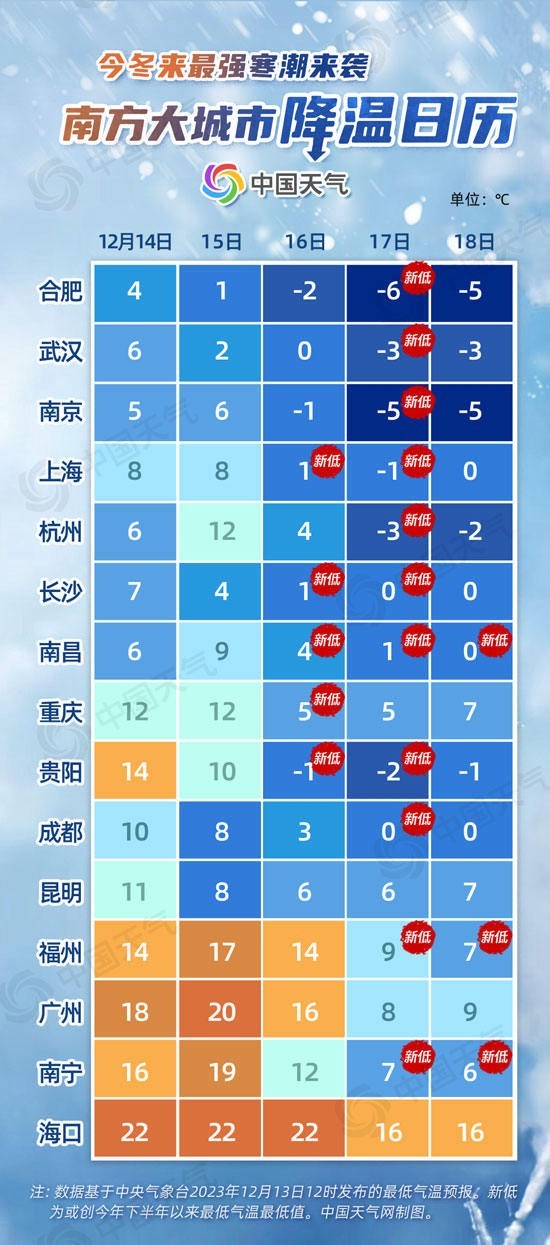 從中國天氣網推出的南方大城市降溫日歷來看,未來五天,合肥、武漢、南京、上海、杭州、貴陽最低氣溫都將逐步下降到冰點以下。南昌16日至18日最低氣溫或連創新低,貴陽最低氣溫將從14℃降至-2℃,降幅可達16℃。