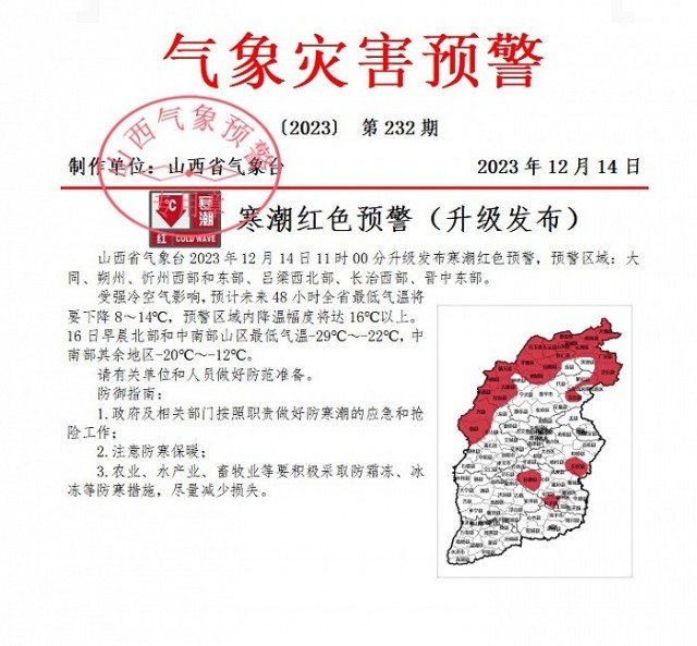 央視網消息:山西省氣象臺2023年12月14日11時00分升級發布寒潮紅色預警,預警區域:大同、朔州、忻州西部和東部、呂梁西北部、長治西部、晉中東部。受強冷空氣影響,預計未來48小時全省最低氣溫將要下降8~14°C,預警區域內降溫福度將達16°C以上。16日早晨北部和中南部山區最低氣溫-29°C~-22°C,中南部其余地區-20°C~-12°C。