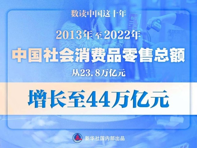 2013年至2022年10年間,中國社會消費品零售總額從23.8萬億元增長至44萬億元,穩居全球第二大消費市場、第一大網絡零售市場和全球第二大進口市場。消費“主引擎”動力強勁,為推動高質量發展、創造高品質生活、構建新發展格局提供有力支撐。