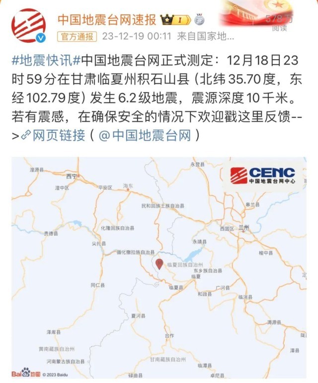 12月18日23時59分,甘肅臨夏州積石山縣發生6.2級地震,震源深度10公里,距離最近高鐵線路近60公里,甘肅多地震感明顯。