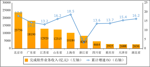 主要軟件大省收入占比持續(xù)提升。1—11月份,軟件業(yè)務(wù)收入居前5名的省份中,北京市,廣東省,江蘇省,山東省,上海市軟件收入分別為23756億元、18190億元、12920億元、12315億元和10184億元,分別增長17.8%、14.2%、13.2%、16.2%和18.5%,五省(市)合計(jì)軟件業(yè)務(wù)收入77365億元,占全國比重為70%,占比較去年同期提高1.2個(gè)百分點(diǎn)。