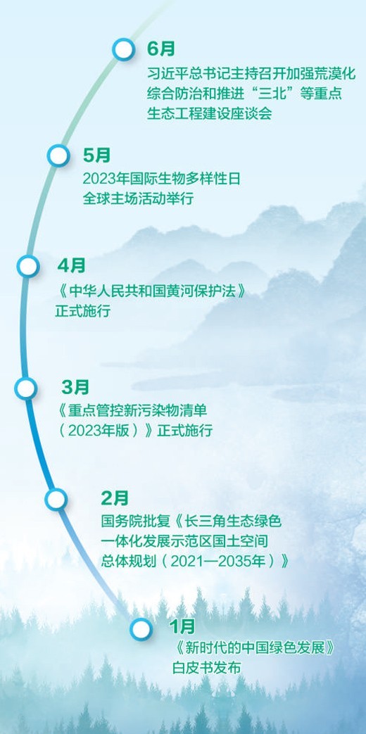 總結新時代10年的實踐經驗,我們對生態文明建設的規律性認識不斷深化。2023年是我國生態文明建設道路上具有里程碑意義的一年。這一年,我國天更藍、地更綠、水更清,美麗中國建設交出滿意答卷,人民群眾獲得感、幸福感、安全感顯著增強。這一年,全國生態環境保護大會召開,我國迎來首個全國生態日,黃河保護法正式施行,“三北”工程三大標志性戰役開局順利,綠色低碳發展腳步不斷加快。
