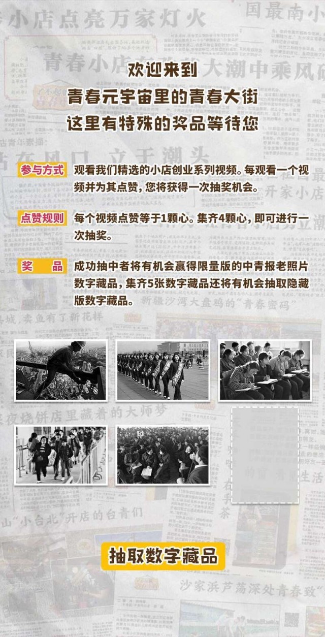 奔跑在青春大街上的青小豹邀請讀者一起玩尋找小店的游戲,大家可以邊體驗邊觀看一個個小店和店主的故事,參加愛心點贊,還可以參與抽獎。獎品是用區塊鏈技術創制的數字藏品——改革開放45年以來中國青年報拍攝的精彩照片。