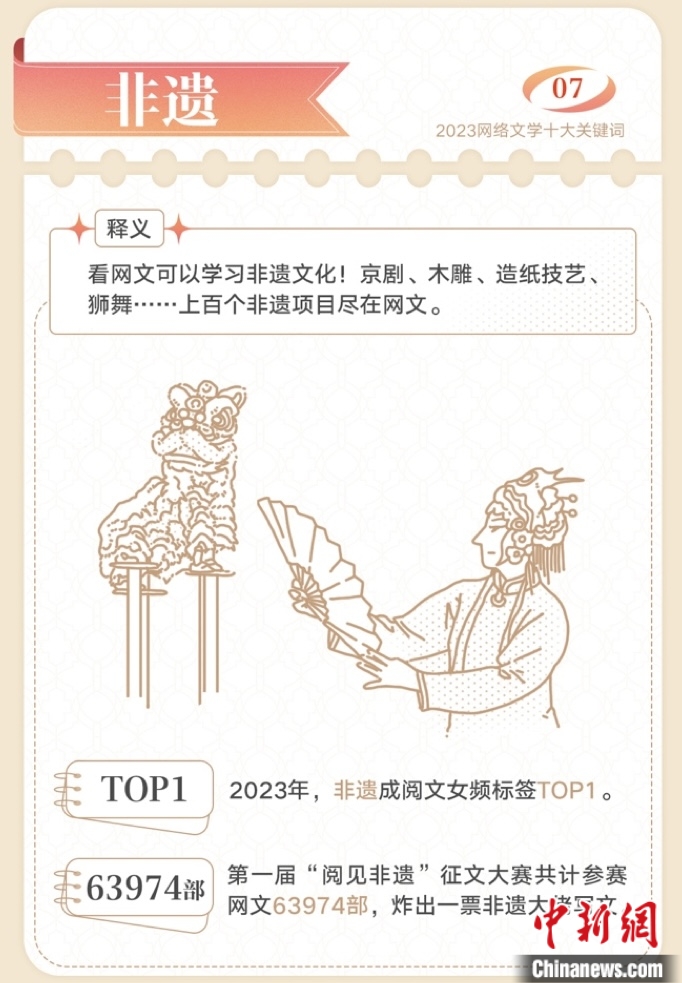 與此同時,網絡文學在高質量傳承傳統文化方面持續發力。京劇、木雕、造紙、獅舞……上百個非遺項目在網文中掀起“傳統文化熱”,“非遺”躍升為閱文女頻標簽TOP1。