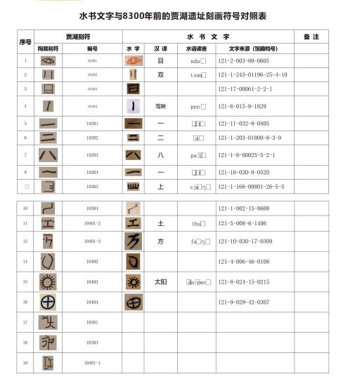 中國貴州省黔南布依族苗族自治州水書申報《世界記憶遺產(chǎn)名錄》領(lǐng)導小組辦公室、黔南州檔案館最新研究發(fā)現(xiàn),中國水書文字與中國河南省偃師市二里頭夏都遺址出土的24個刻畫符號相同,與中國浙江省良渚文化遺址出土的700多個刻畫符號中的104個符號相同,與中國安徽省蚌埠市雙墩遺址出土的600多個刻畫符號中的73個符號相同,與中國河南省賈湖遺址出土的19個刻畫符號中的16個符號相同。