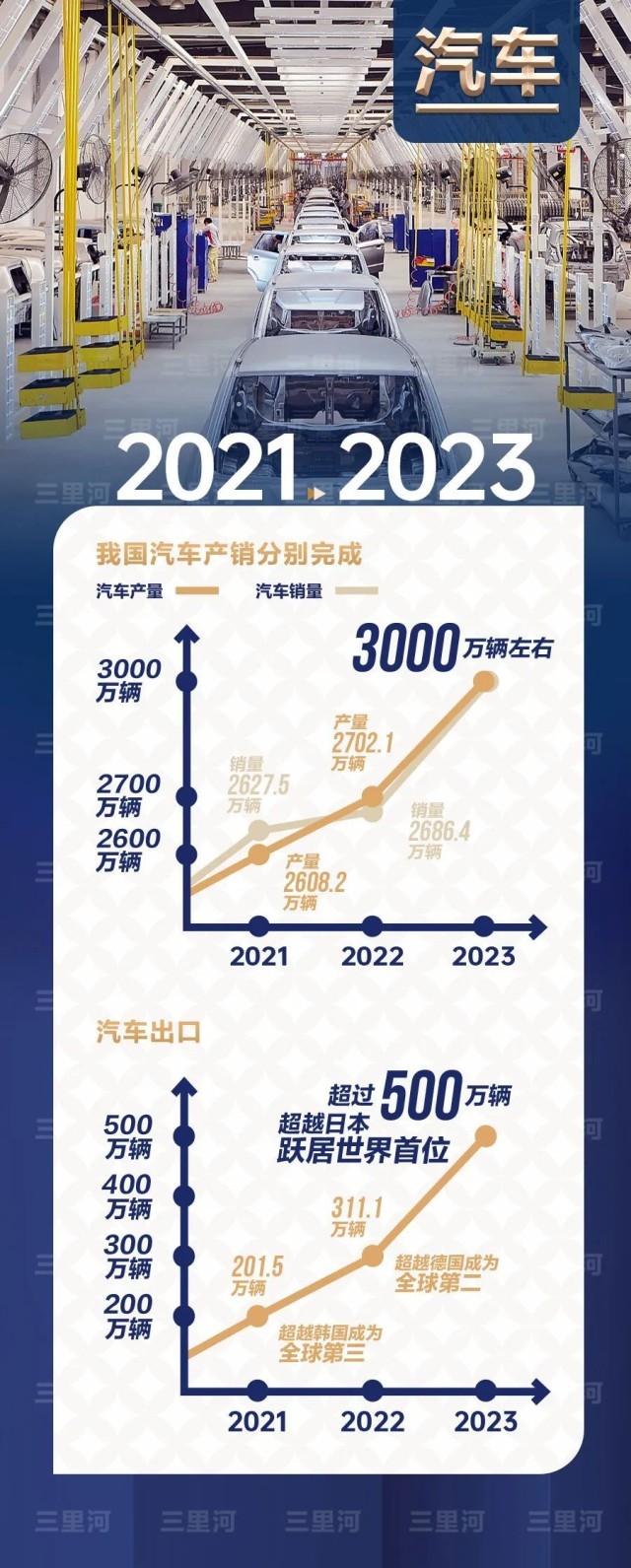 2023年,全年汽車產銷量預計達3000萬輛左右、創歷史新高,出口超過500萬輛,超越日本,躍居世界首位。