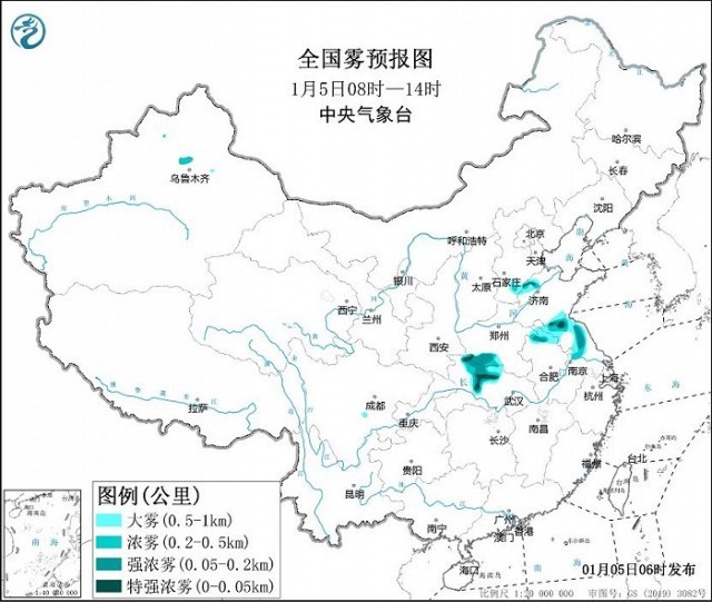 中央氣象臺1月5日06時繼續發布大霧黃色預警