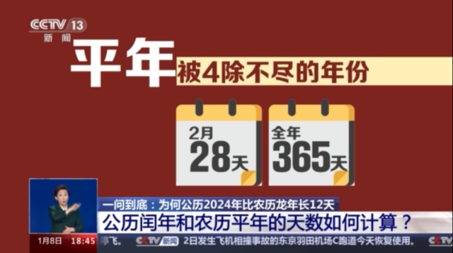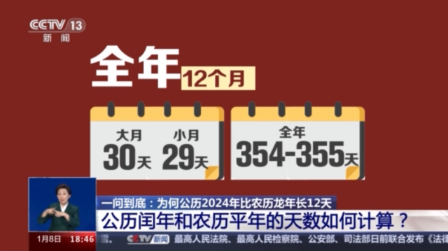 中國科學院紫金山天文臺發布的日歷資料顯示,公歷2024年為閏年,2月有29天,全年共有366天,而即將到來的農歷甲辰年(龍年)則是平年,全年共有354天。為什么公歷2024年比農歷龍年多出了12天?