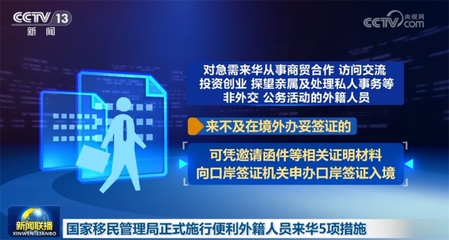 5項新舉措主要包括:放寬來華外籍人員申辦口岸簽證條件。對急需來華從事商貿合作、訪問交流、投資創業、探望親屬及處理私人事務等非外交、公務活動的外籍人員,來不及在境外辦妥簽證的,可憑邀請函件等相關證明材料向口岸簽證機關申辦口岸簽證入境。