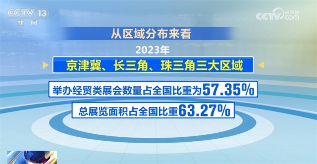 從區域分布來看,2023年京津冀、長三角、珠三角三大區域舉辦經貿類展會數量占全國比重為57.35%,總展覽面積占全國比重63.27%。