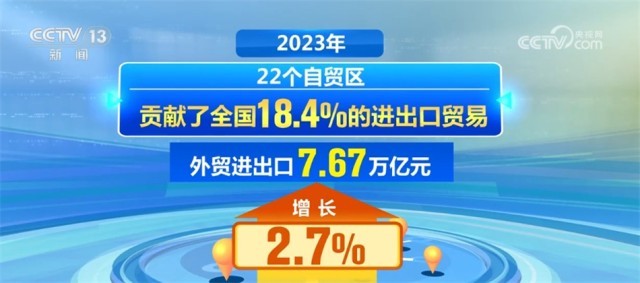 2023年,我國自貿試驗區(qū)擴容至22個。22個自貿區(qū)貢獻了全國18.4%的進出口貿易,外貿進出口7.67萬億元,增長2.7%。