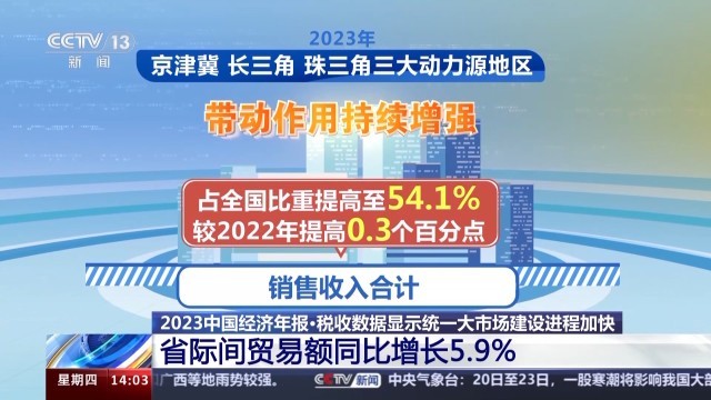 國家稅務總局新聞發言人 黃運:2023年,衡量國內各省之間貿易聯系緊密程度的省際間貿易額同比增長5.9%,占全國貿易總額比重提高至42.7%,較2022年提高0.5個百分點,而且也呈逐年提升的態勢,反映經濟內循環更加順暢,統一大市場建設進程加快。