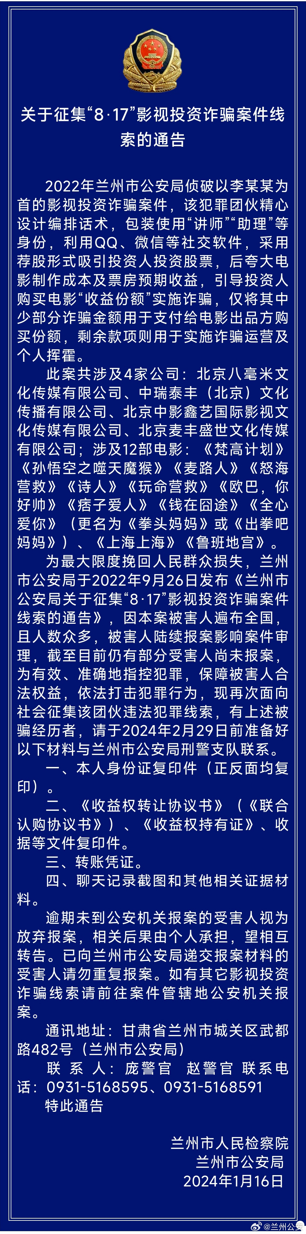 為最大限度挽回人民群眾損失,蘭州市公安局早在2022年9月26日發布《蘭州市公安局關于征集“8·17”影視投資詐騙案件線索的通告》,但因本案被害人遍布全國,且人數眾多,受害人陸續報案影響案件審理,截至目前仍有部分受害人尚未報案。