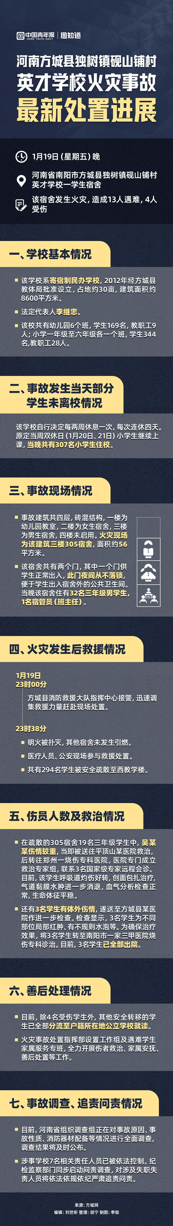 1月19日晚,河南省方城縣獨樹鎮硯山鋪村英才學校一宿舍發生火災,事故造成13人遇難,4人受傷。1月23日,方城縣通報了部分事故情況:當晚有307名小學生住校,火災現場為宿舍樓三樓305宿舍,面積56平方米;當晚該宿舍住有32名三年級男學生,1名宿管員(班主任);涉事學校7名相關責任人員已被依法控制。