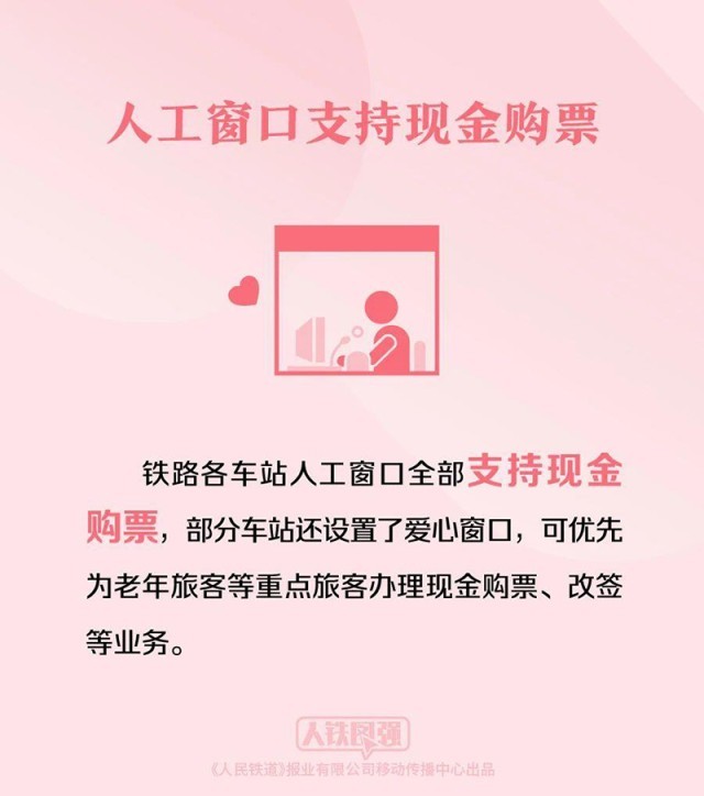 鐵路各車站人工窗口全部支持現金購票,部分車站還設置了愛心窗口,可優先為老年旅客等重點旅客辦理現金購票、改簽等業務。