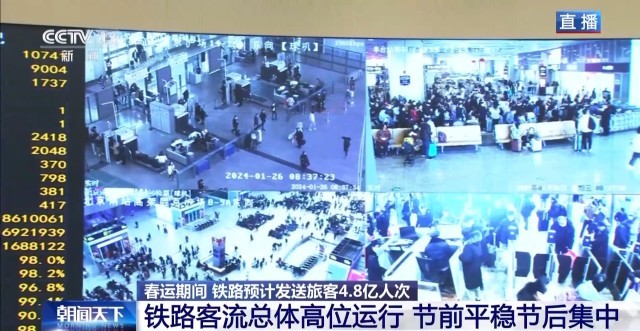 總臺(tái)央視記者 陳晰:40天春運(yùn),全國(guó)鐵路預(yù)計(jì)發(fā)送旅客4.8億人次,日均1200萬人次。今天是春運(yùn)首日,全國(guó)鐵路預(yù)計(jì)發(fā)送旅客1060萬人次。2024年春運(yùn)的火車票預(yù)售已經(jīng)從1月12日開始發(fā)售,從目前的售票情況來看,旅客出行需求旺盛。