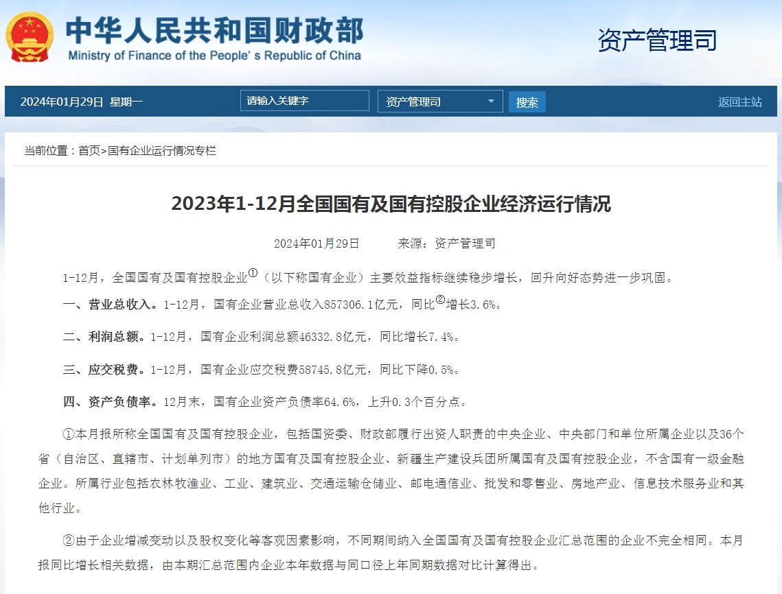 1月29日,財政部在其官方網站公布2023年1-12月全國國有及國有控股企業經濟運行情況。