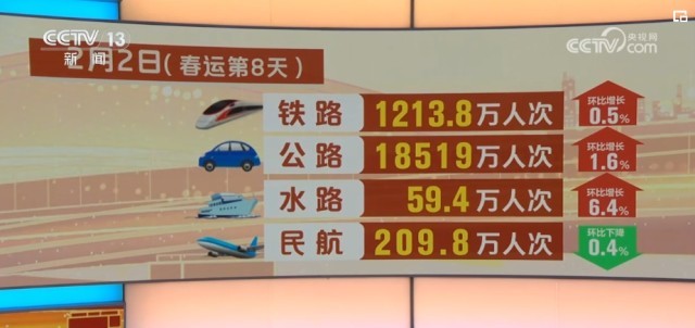 具體來看,2月2日,鐵路客運量1213.8萬人次,環比增長0.5%;公路人員流動量18519萬人次,環比增長1.6%;水路客運量59.4萬人次,環比增長6.4%;民航客運量209.8萬人次,環比下降0.4%。