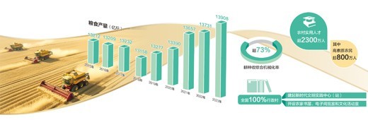 2023年,克服黃淮罕見“爛場雨”、華北東北局地嚴重洪澇、西北局部干旱等災害影響,全年糧食產量13908.2億斤,高基數上增產177.6億斤,再創歷史新高;大豆播種面積穩中有增,連續兩年穩定在1.5億畝以上。今年中央一號文件明確提出確保糧食產量保持在1.3萬億斤以上的目標,重點是穩面積、增單產兩手發力。
