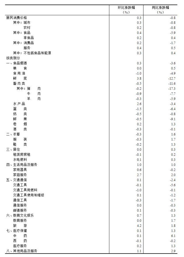 1月份,受上年同期春節錯月高基數影響,全國居民消費價格同比下降0.8%。其中,城市下降0.8%,農村下降0.8%;食品價格下降5.9%,非食品價格上漲0.4%;消費品價格下降1.7%,服務價格上漲0.5%。在1月份-0.8%的CPI(居民消費價格指數)同比變動中,翹尾影響約為-1.1個百分點;今年價格變動的新影響約為0.3個百分點。