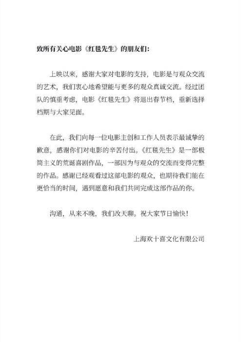 果然,上映6天后,《紅毯先生》宣布撤檔,表示“期待能在更恰當的時間,遇到愿意和我們共同完成這部作品的你”。事實上,這已是該片第二次更換檔期,原本定的上映日期是2023年11月17日。