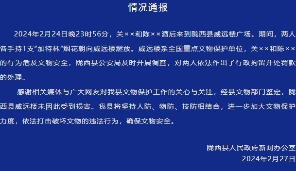 2024年2月24日晚23時(shí)56分,關(guān)××和陳××酒后來到隴西縣威遠(yuǎn)樓廣場。期間,兩人各手持1支“加特林”煙花朝向威遠(yuǎn)樓燃放。威遠(yuǎn)樓系全國重點(diǎn)文物保護(hù)單位,關(guān)××和陳××的行為危及文物安全,隴西縣公安局及時(shí)開展調(diào)查,對兩人依法作出了行政拘留并處罰款的處理。