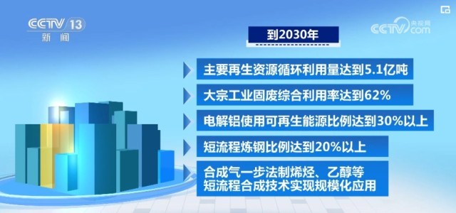 《指導(dǎo)意見》提出,到2030年,主要再生資源循環(huán)利用量達到5.1億噸,大宗工業(yè)固廢綜合利用率達到62%,電解鋁使用可再生能源比例達到30%以上,短流程煉鋼比例達到20%以上,合成氣一步法制烯烴、乙醇等短流程合成技術(shù)實現(xiàn)規(guī)模化應(yīng)用。