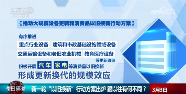 央視網消息:日前,國務院常務會議審議通過了《推動大規模設備更新和消費品以舊換新行動方案》。行動方案有哪些亮點?新一輪“以舊換新”和以往有什么不同?來看專家的解讀。