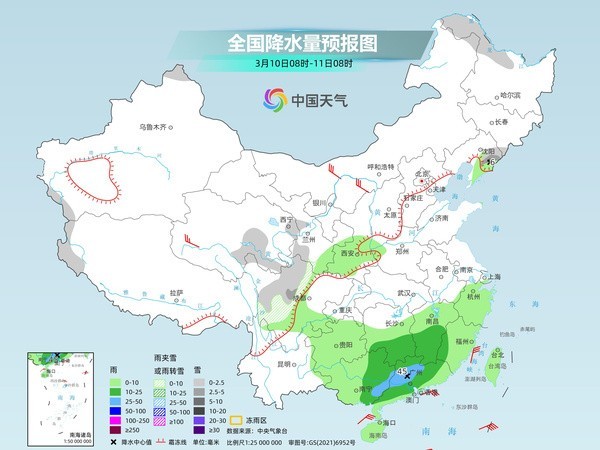 昨天,南方降雨范圍增大、強度增強,華南部分地區出現較強降雨,北方大部晴朗干燥,西北地區局地出現較強降雪。監測顯示,廣西南部、廣東中北部、江西南部等地出現中到大雨;青海東部、甘肅南部出現小到中雪或雨夾雪,局地大雪。