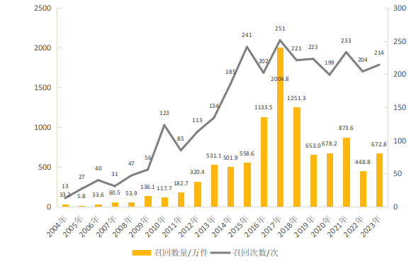 圖1 2004—2023年汽車產品召回的次數與數量