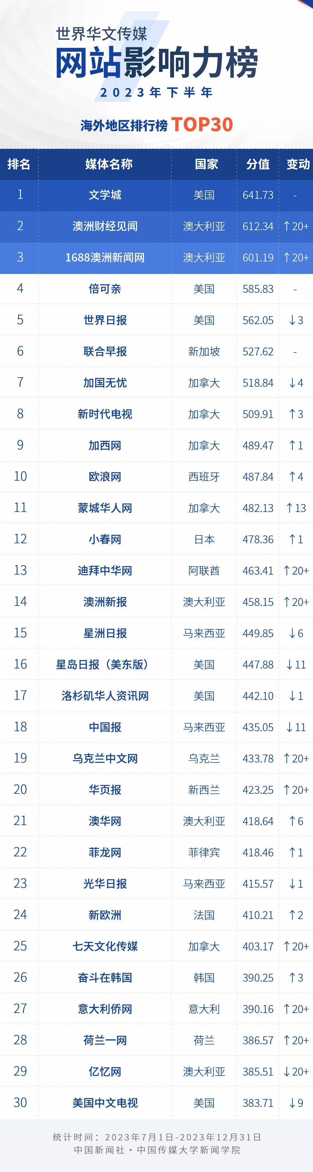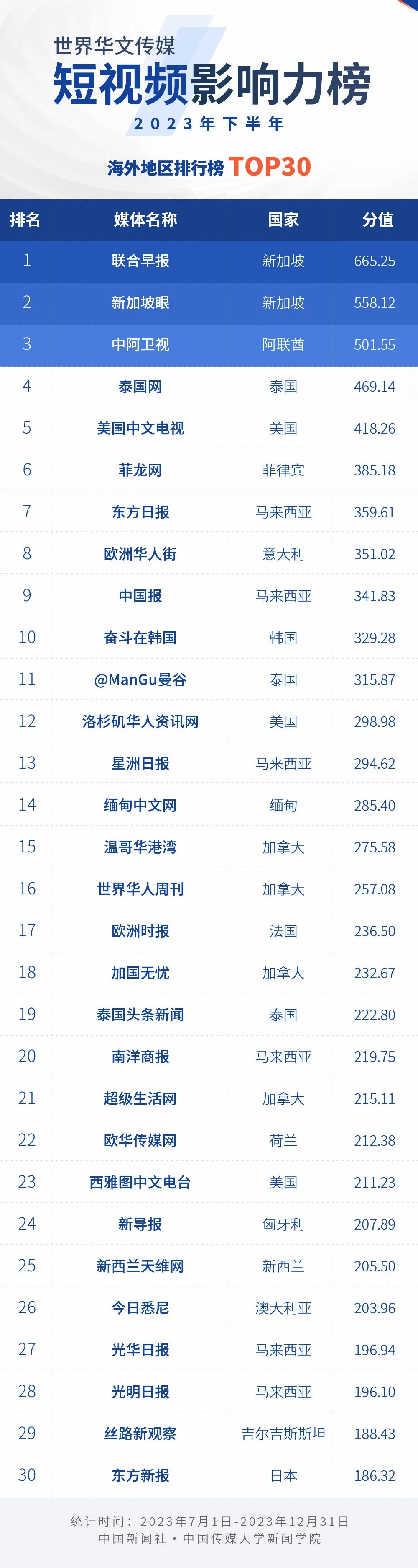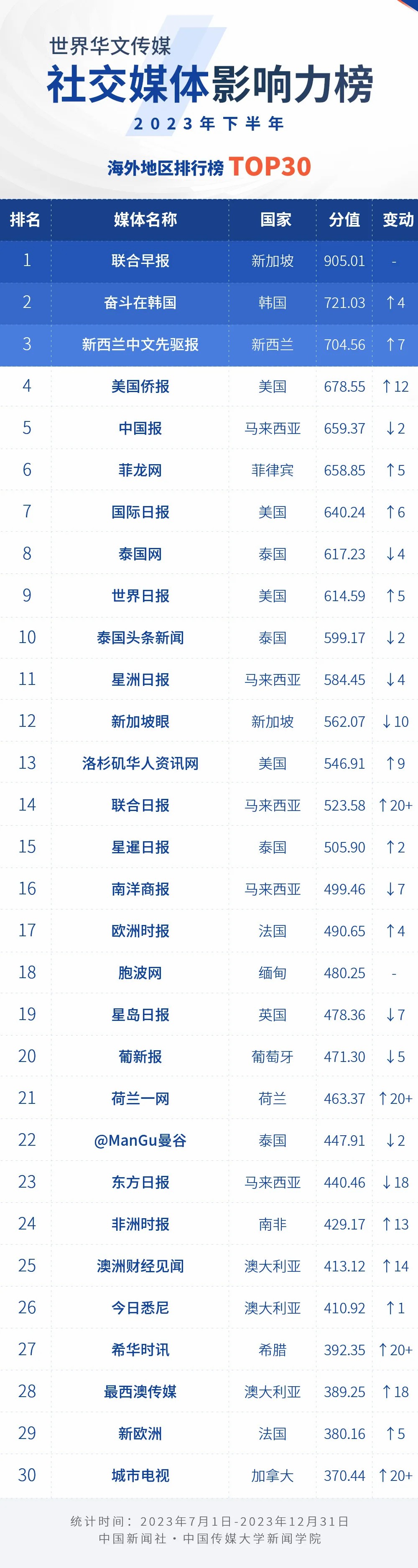 中國新聞社與中國傳媒大學新聞學院持續開展“世界華文傳媒新媒體影響力”測評項目,現根據2023年下半年世界華文傳媒新媒體的業務數據,發布2023年下半年榜。