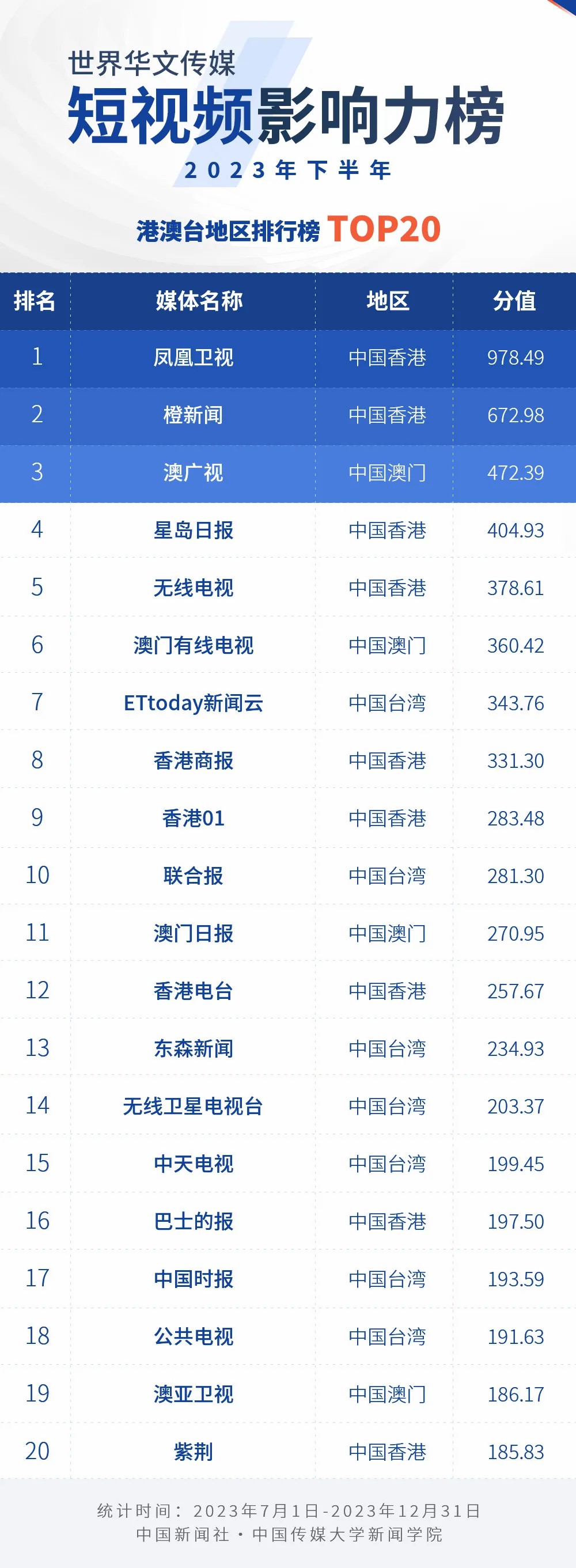 2023年下半年世界華文傳媒新媒體影響力榜