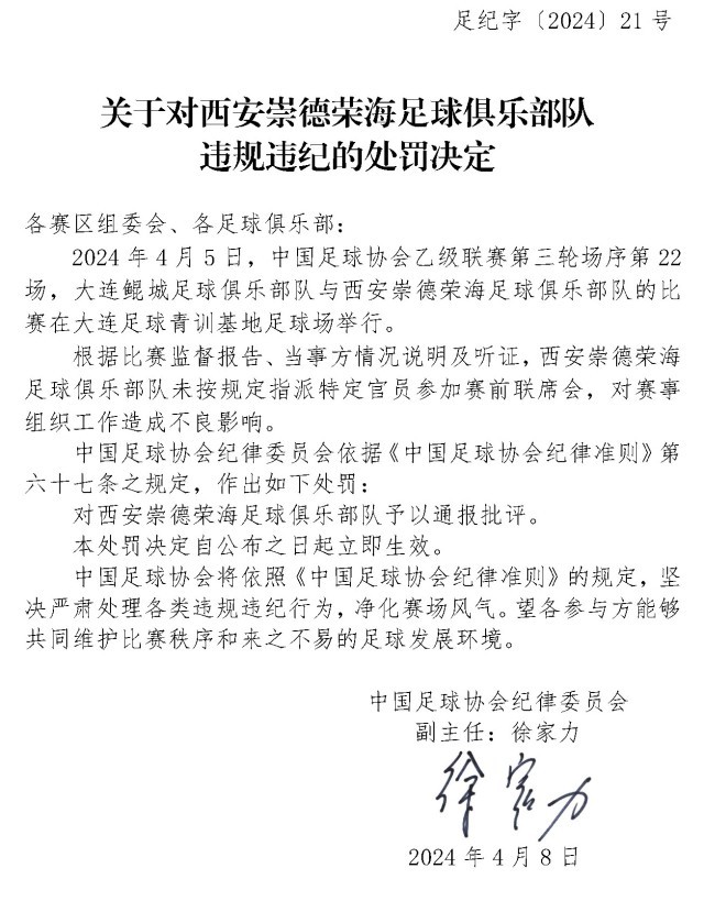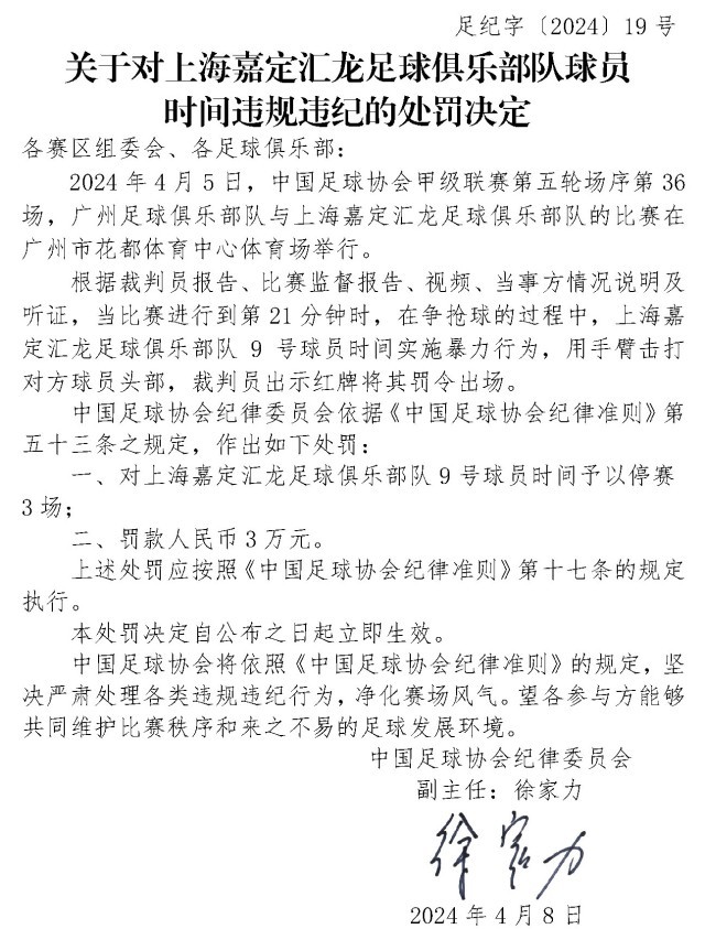 央視網消息:4月10日,中國足協網站發布《關于對上海嘉定匯龍足球俱樂部隊球員時間違規違紀的處罰決定》《關于對西安崇德榮海足球俱樂部隊違規違紀的處罰決定》《關于對大連鯤城足球俱樂部隊違規違紀的處罰決定》三份處罰決定。中甲聯賽上海嘉定匯龍9號球員因暴力行為被停賽罰款。中乙聯賽大連鯤城與西安崇德榮海兩家俱樂部因未按規定指派特定官員參加賽前聯席會,被通報批評。