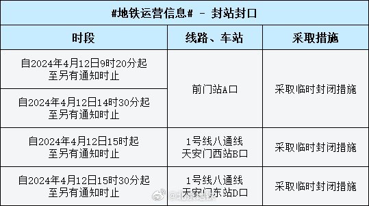央視網消息:據@北京地鐵 微博消息,自2024年4月12日9時20分起至另有通知時止,前門站A口采取臨時封閉措施;自2024年4月12日14時30分起至另有通知時止,前門站A口采取臨時封閉措施;自2024年4月12日15時起至另有通知時止,1號線八通線天安門西站B口采取臨時封閉措施;自2024年4月12日15時30分起至另有通知時止,1號線八通線天安門東站D口采取臨時封閉措施。