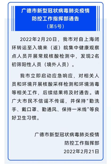 記者從安徽省廣德市新型冠狀病毒肺炎疫情防控工作指揮部獲悉,2月20日,廣德市對自上海閉環轉運至入境來(返)皖集中健康觀察點人員開展常規核酸檢測中,發現2名初篩陽性人員(境外人員)。