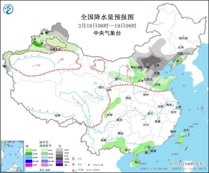 3月18日8時至19日8時,新疆北北疆大部和南疆西部山區、內蒙古中部、陜西北部、山西北部、京津冀大部、山東中北部、遼寧大部、吉林東南部等地部分地區有小到中雪或雨夾雪,其中,河北北部、內蒙古中部偏南地區、遼寧中部、新疆北疆西北部等地部分地區有大到暴雪。新疆伊犁河谷、陜西中部、山東南部、四川盆地西北部、云南東南部、廣西西部、廣東西南部、海南島、臺灣島等地部分地區有小雨,局地中雨。內蒙古中西部、新疆南疆盆地、陜西北部等地部分地區有4~6級風。