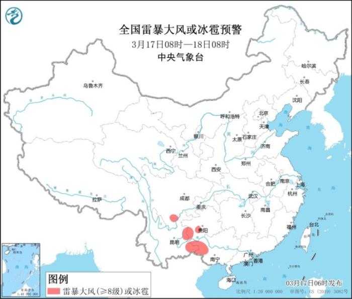 預計3月17日8時至18日8時,四川南部、貴州西南部、云南東部、廣西西部等地的部分地區將有8~10級雷暴大風或冰雹天氣;安徽南部、江蘇中南部、湖南南部、江西中東部、浙江北部和西南部、福建北部和西部、貴州東南部、廣西西部和東北部、廣東西北部等地的部分地區將有短時強降水天氣,小時雨量20~40毫米,局地可達50毫米以上。預計,強對流的主要影響時段為今天白天至前半夜。中央氣象臺3月17日6時繼續發布強對流天氣藍色預警。