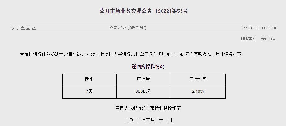 央行開展300億元7天期逆回購操作,中標(biāo)利率2.10%